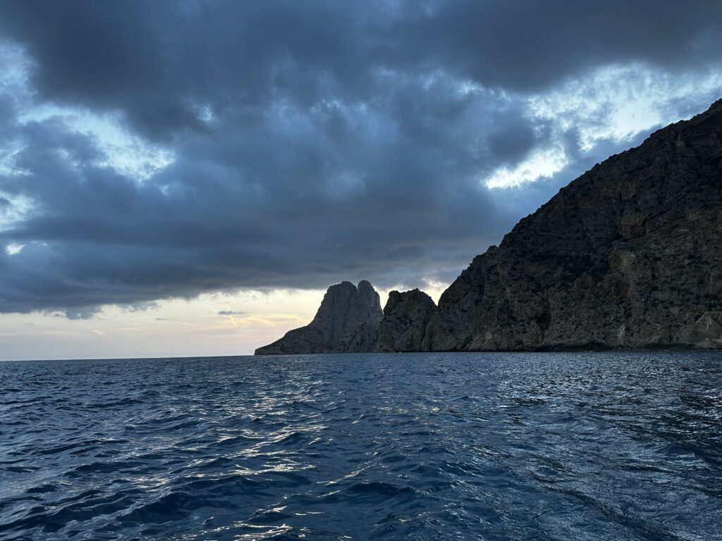 Wir verlassen unsere Boje des Club Nautico Port Sant Antoni de Portmany gegen 12 Uhr bei schönstem Sonnenschein. Wir segeln weiter nach Westen. Eine leichte Brise aus Nordost bringt uns langsam aber sicher die Westküste Ibizas hinunter. Wir gleiten lautlos dahin, keine Welle die Moana bremsen würde. 6 Knoten Wind. Immerhin 3 Knoten zeigt unsere Logge.