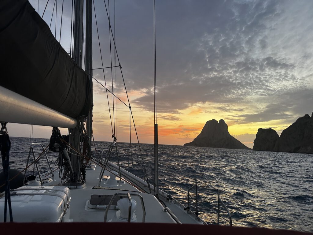 Wir kommen im Abendlicht gemütlich in dieser schönen und noch ruhigen Bucht an und lassen den Anker auf 10m Wassertiefe fallen. Wir geben 50m Kette. Der Ausblick auf Es Vedra, der vorgelagerten schroffen Felseninsel ist phänomenal.